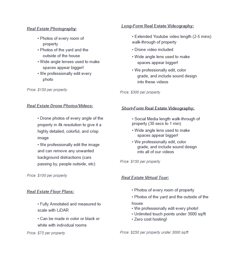 Aerial photo and video services that showcase your property from breathtaking angles. Perfect for showing property lines, highlighting large lots, unique layouts, and surrounding neighborhoods!